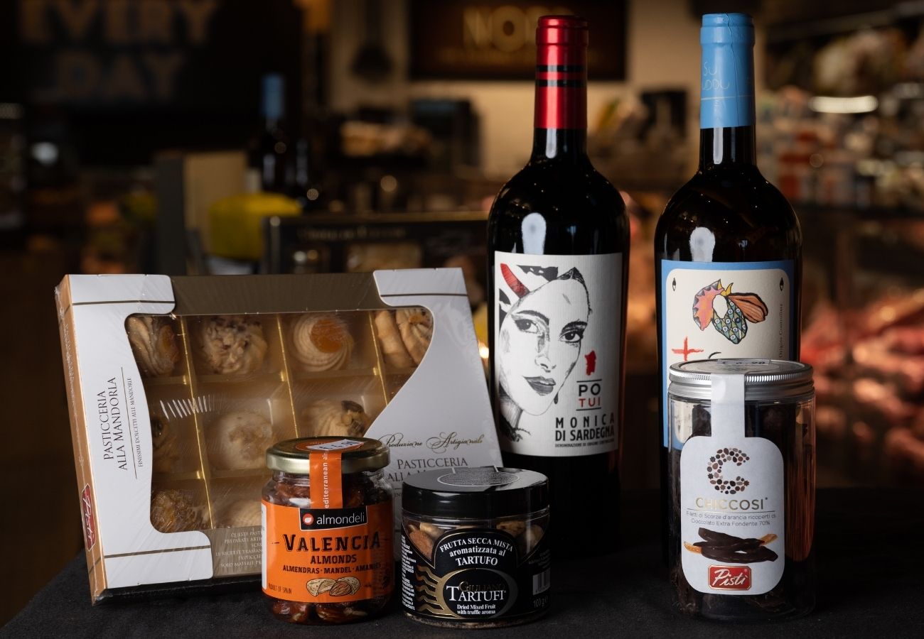 Silvio Carta “Su Puddu” Wine, Silvio Carta “Po Tui” Wine, an assortment of almond cookies, orange peels covered in extra dark chocolate, Giuliano Tartufi nuts, Valencia almonds, NORD Exclusive Box.