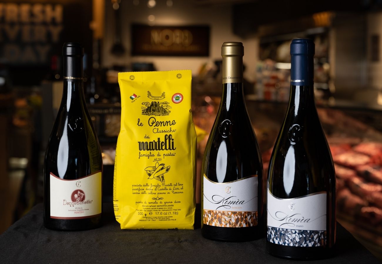 Puglia I.G.T. Fiano “Klima”, Puglia I.G.T. Moscato, Puglia I.G.T. Primitivo “Donna Carlotta”, Artisan Martelli Penne Pasta, NORD Exclusive Box.