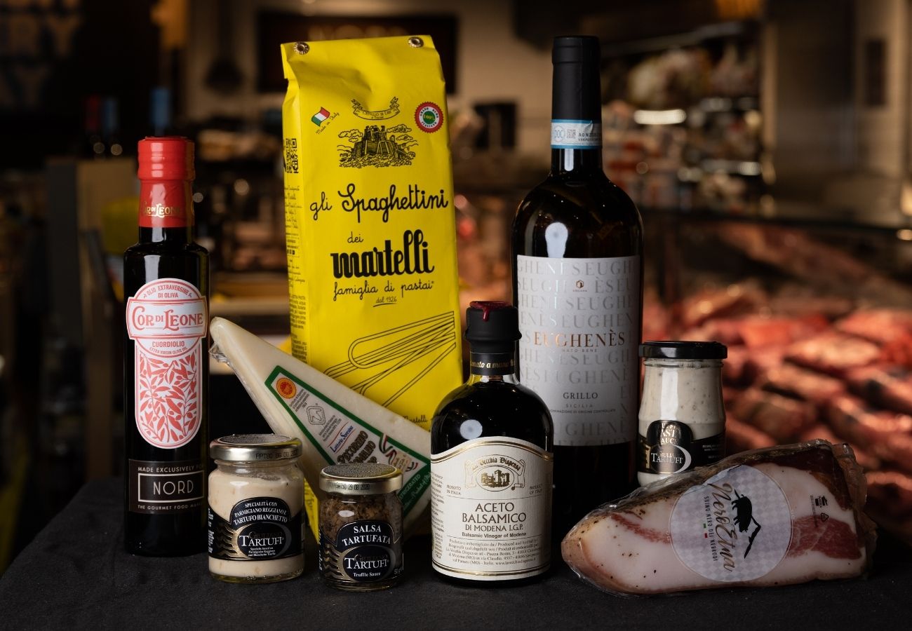 Eughenes Grillo Sicilian Wine, Artisan Martelli Spaghettini, Nobili Sapori Balsamic Vinegar of Modena I.G.P. (250ml), Core di Leone Extra Virgin Olive Oil, Pecorino Cheese, Guanciale, Giuliano Tartufi Truffle with Parmesan, Giuliano Tartufi Truffle Sauce, Giuliano Tartufi Béchamel with Summer Truffle, NORD Exclusive Box.