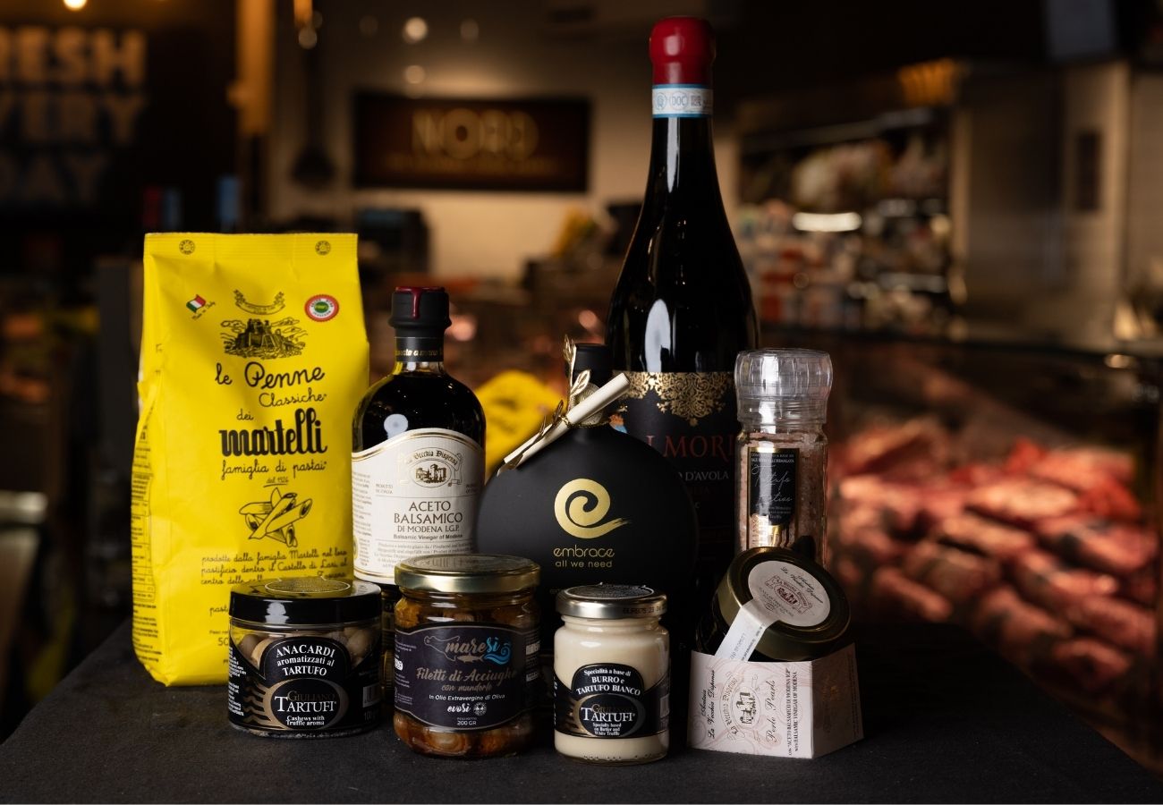 Imore Nero d’Avola Sicilian Wine, Nobili Sapori Balsamic Vinegar of Modena I.G.P. (250ml), Embrace Extra Virgin Olive Oil (100ml), Artisan Martelli Penne Pasta, Giuliano Tartufi Truffle Butter, Filetti di Acciughe con Mandorle (Anchovy Fillets with Almonds), Pearls with Balsamic Vinegar of Modena I.G.P., Giuliano Tartufi Nuts, Giuliano Tartufi Truffle Salt, NORD Exclusive Box.