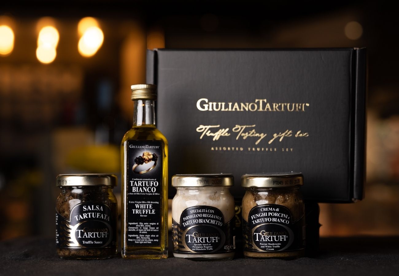 Extra Virgin Olive Oil Dressing with White Truffle, Parmesan and Bianchetto Truffle Cream, Porcini Mushroom and White Truffle Cream (45g), Truffle Sauce (50g).