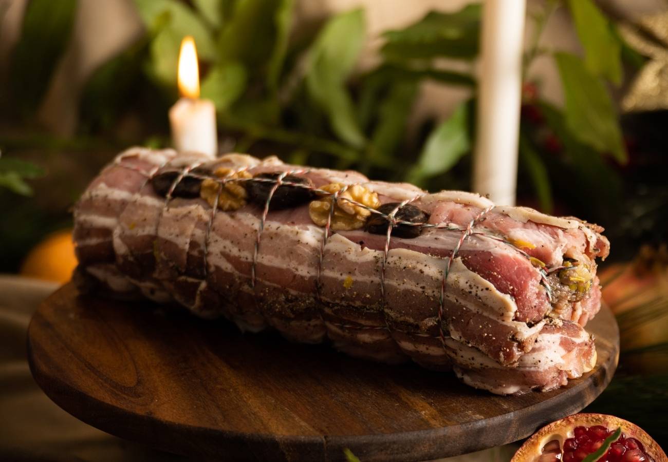 Pork loin filled with Armagnac-soaked dates, walnuts, leek, and thyme. Priced per piece (approx. 1.2kg), serving 4-5.