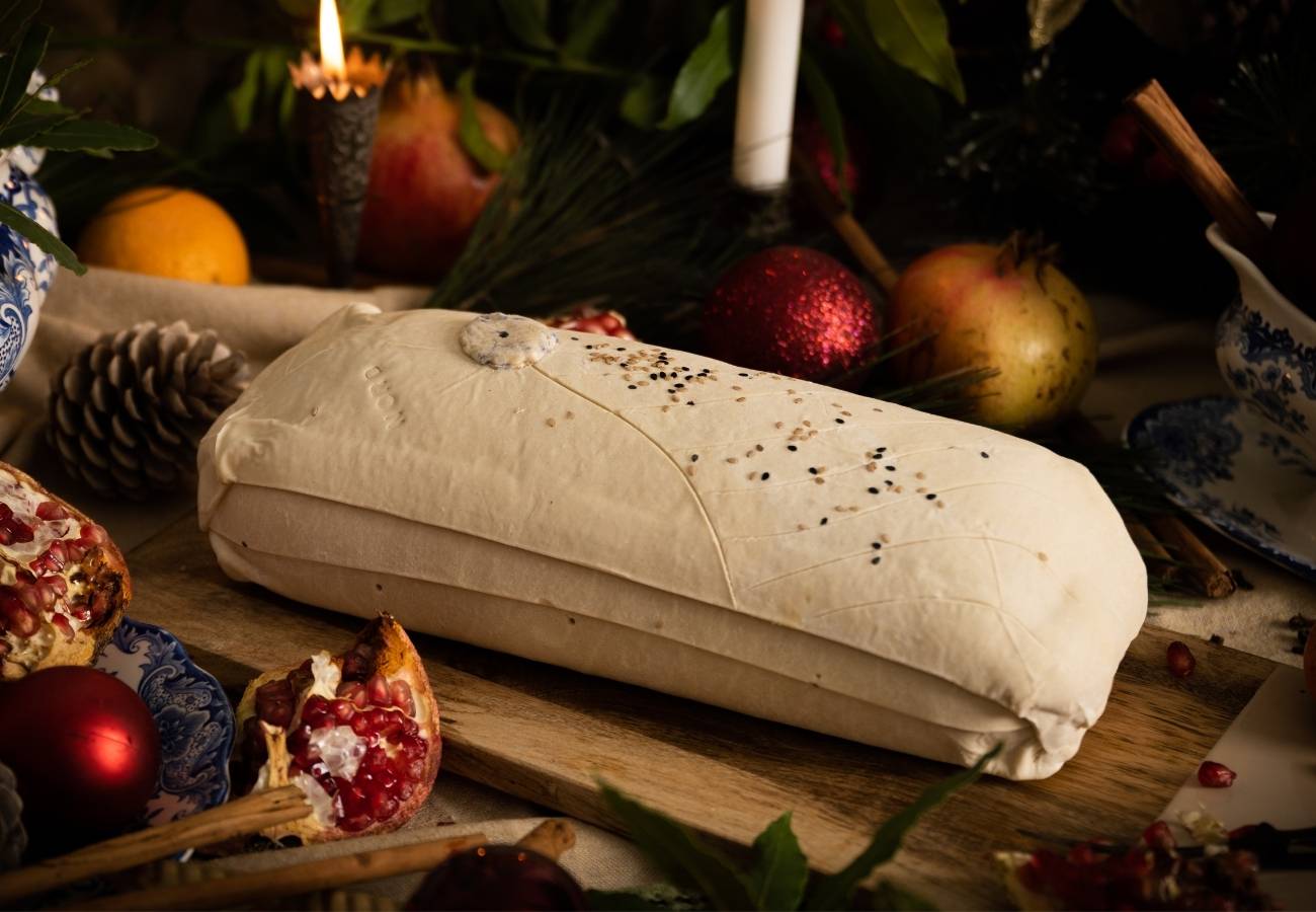 Whole deboned chicken in puff pastry with a mousse of chicken, porcini, chestnut mushrooms, chèvre, and chives.