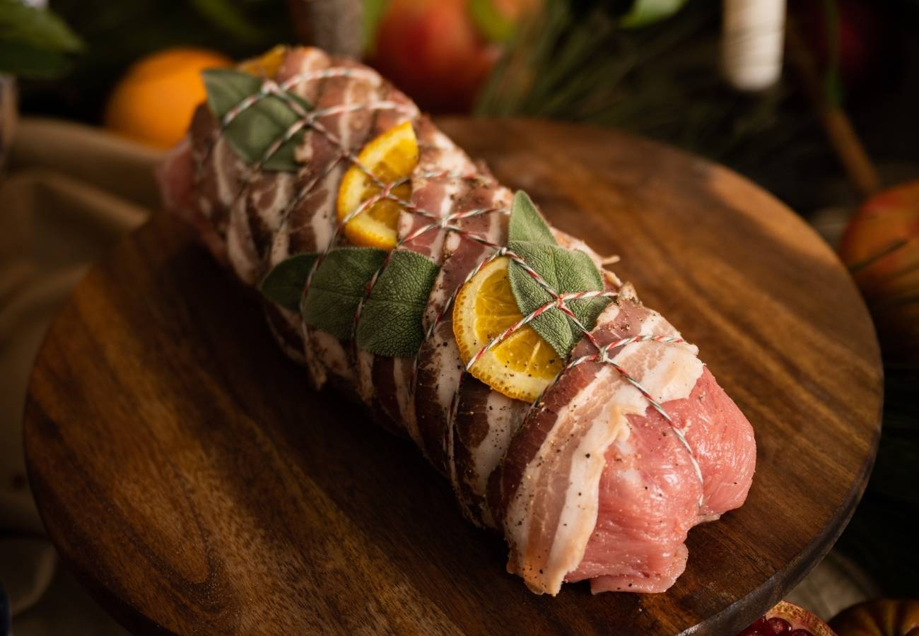 Rolled pork fillet with prunes, pancetta, walnuts, and an orange, cinnamon & honey glaze. Priced per piece (approx. 1.5kg), serving 4.